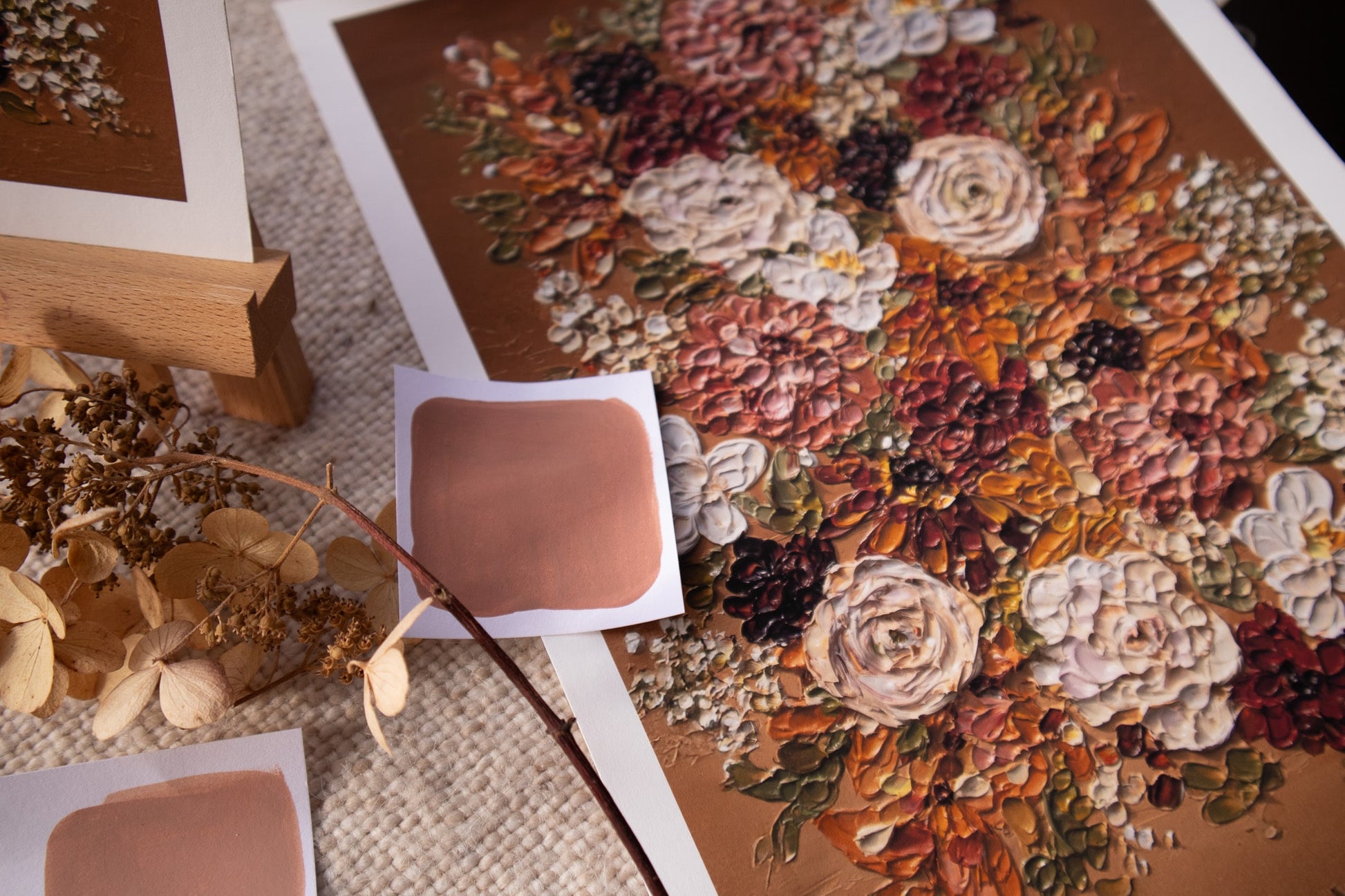 "Autumn I" is a lovely warm brown print with rich contrasting florals. It is inspired by the cozy and brilliant themes of autumn, but this elegant print would adorn any space beautifully every day of the year!