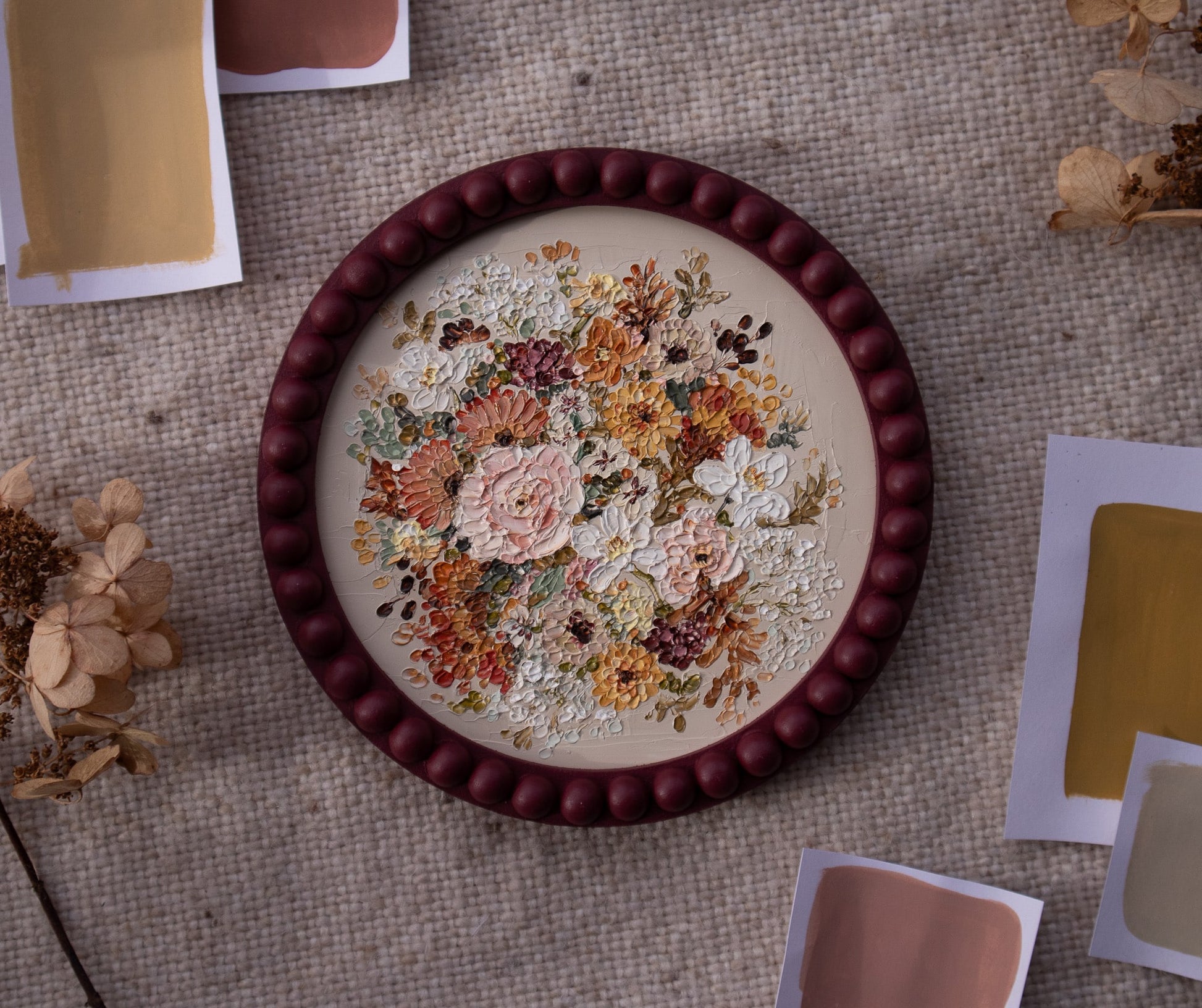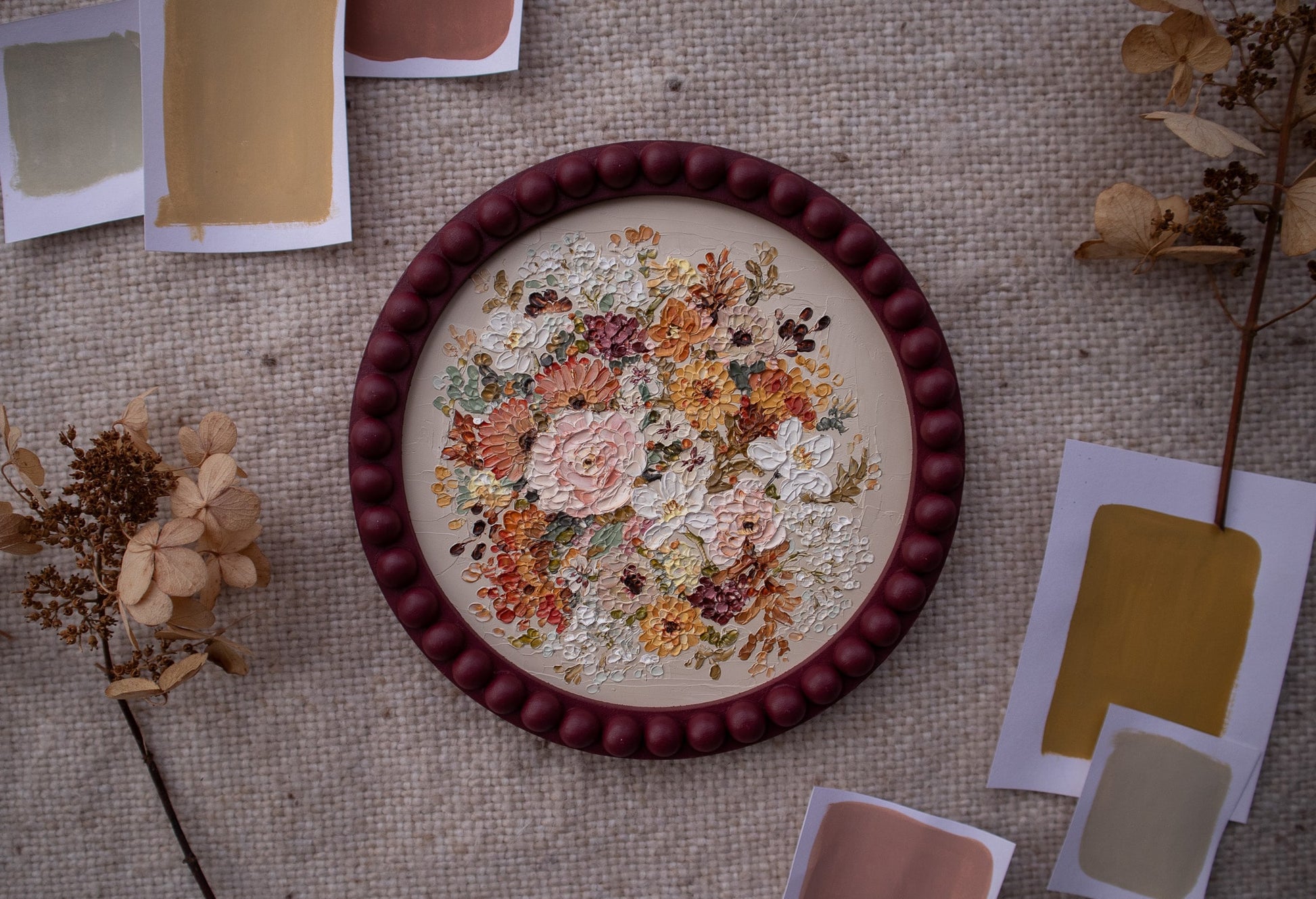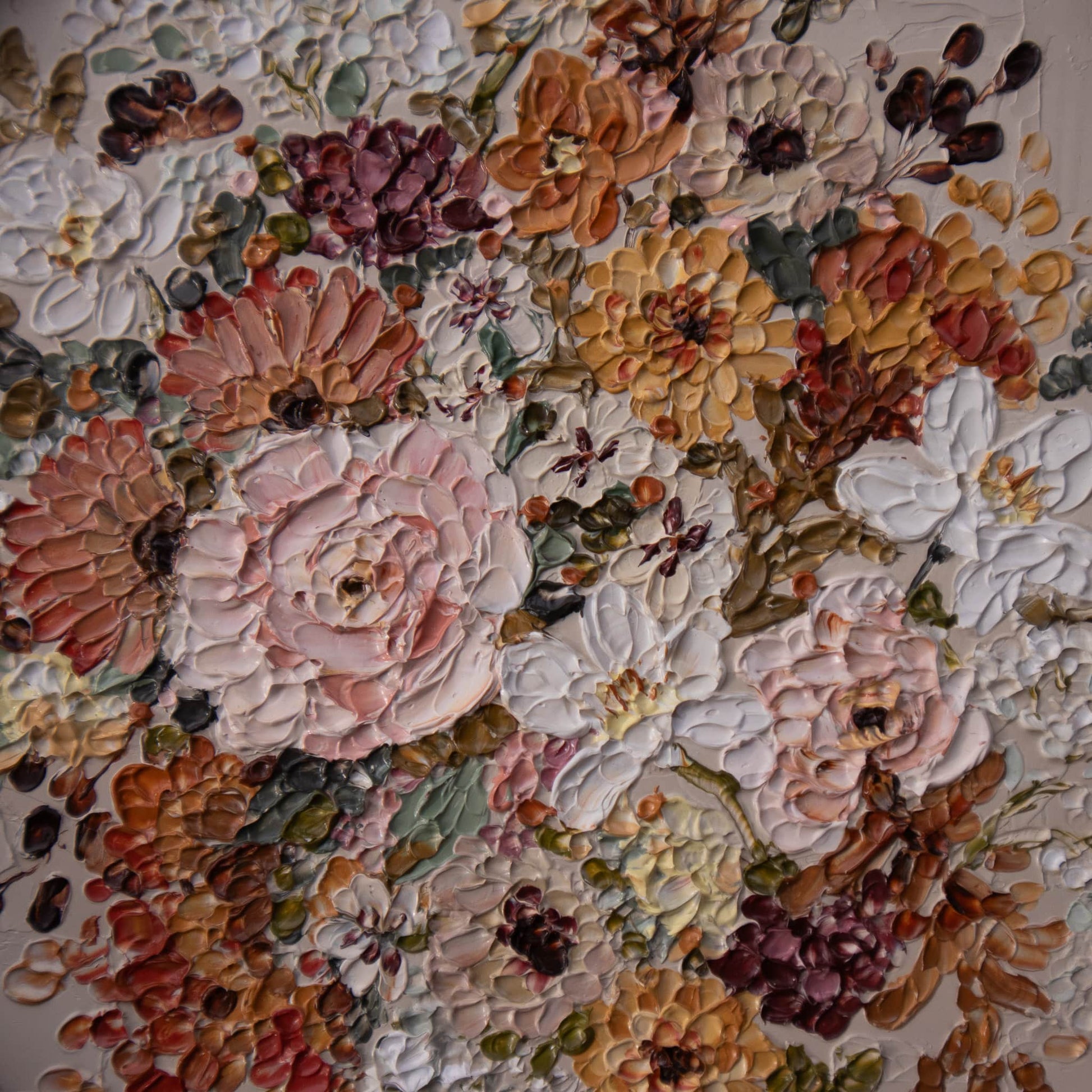 "Autumn III" is a gorgeous original with a neutral background contrasted by a rich, circular bouquet of autumn florals. This piece is inspired by the beauty and elegance of the changing season and showcases all of the vibrant autumn colors we know and cherish.