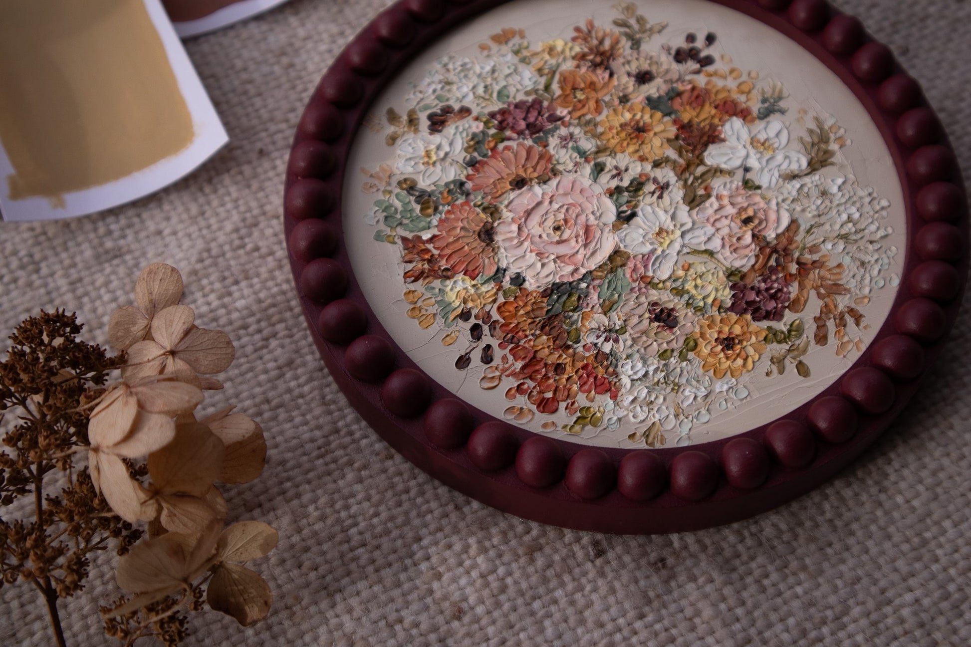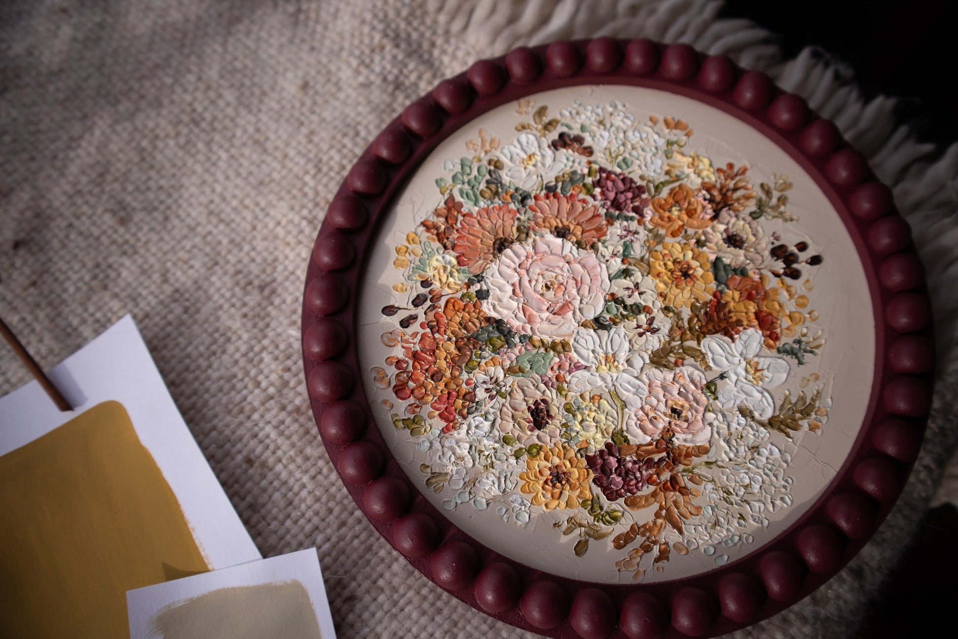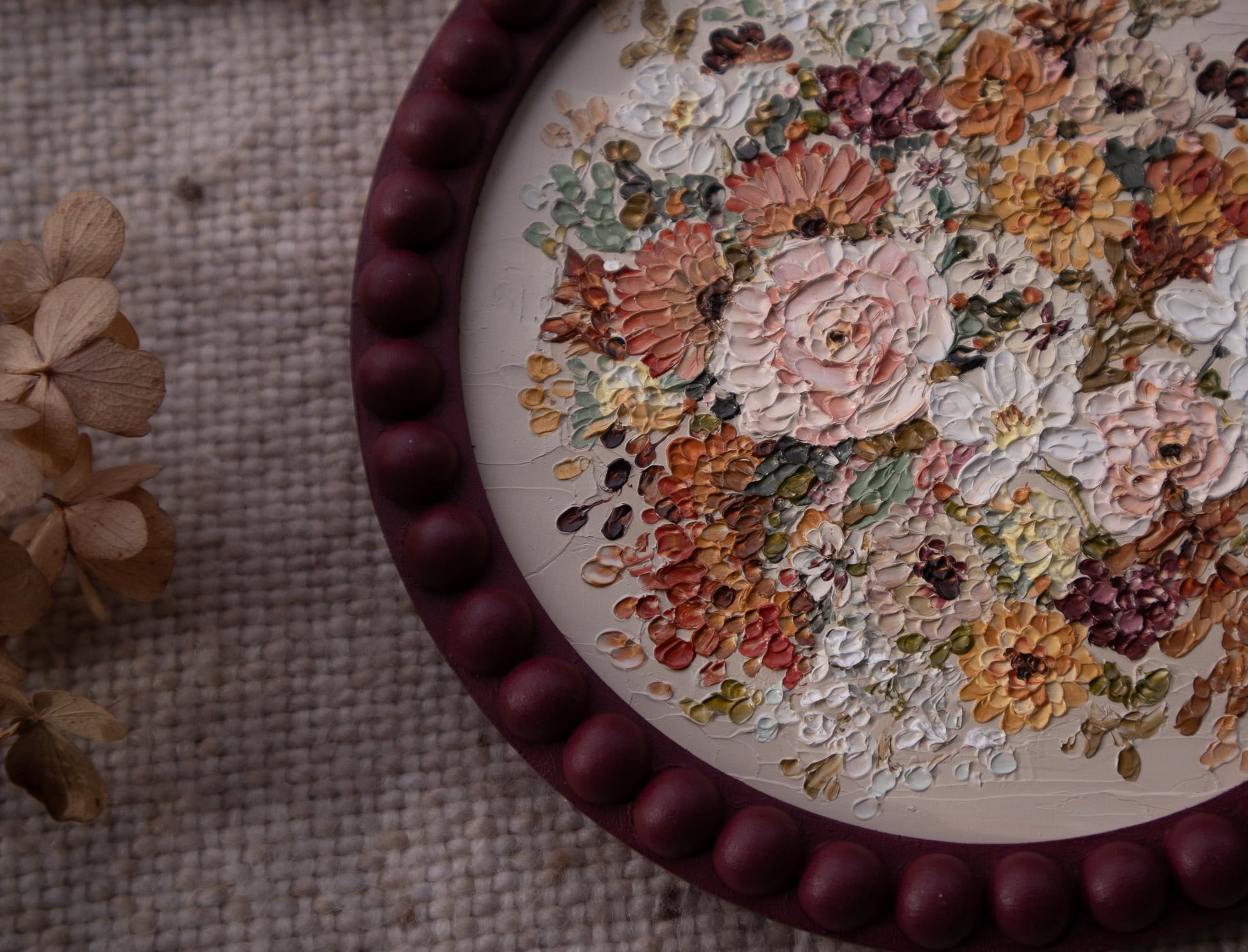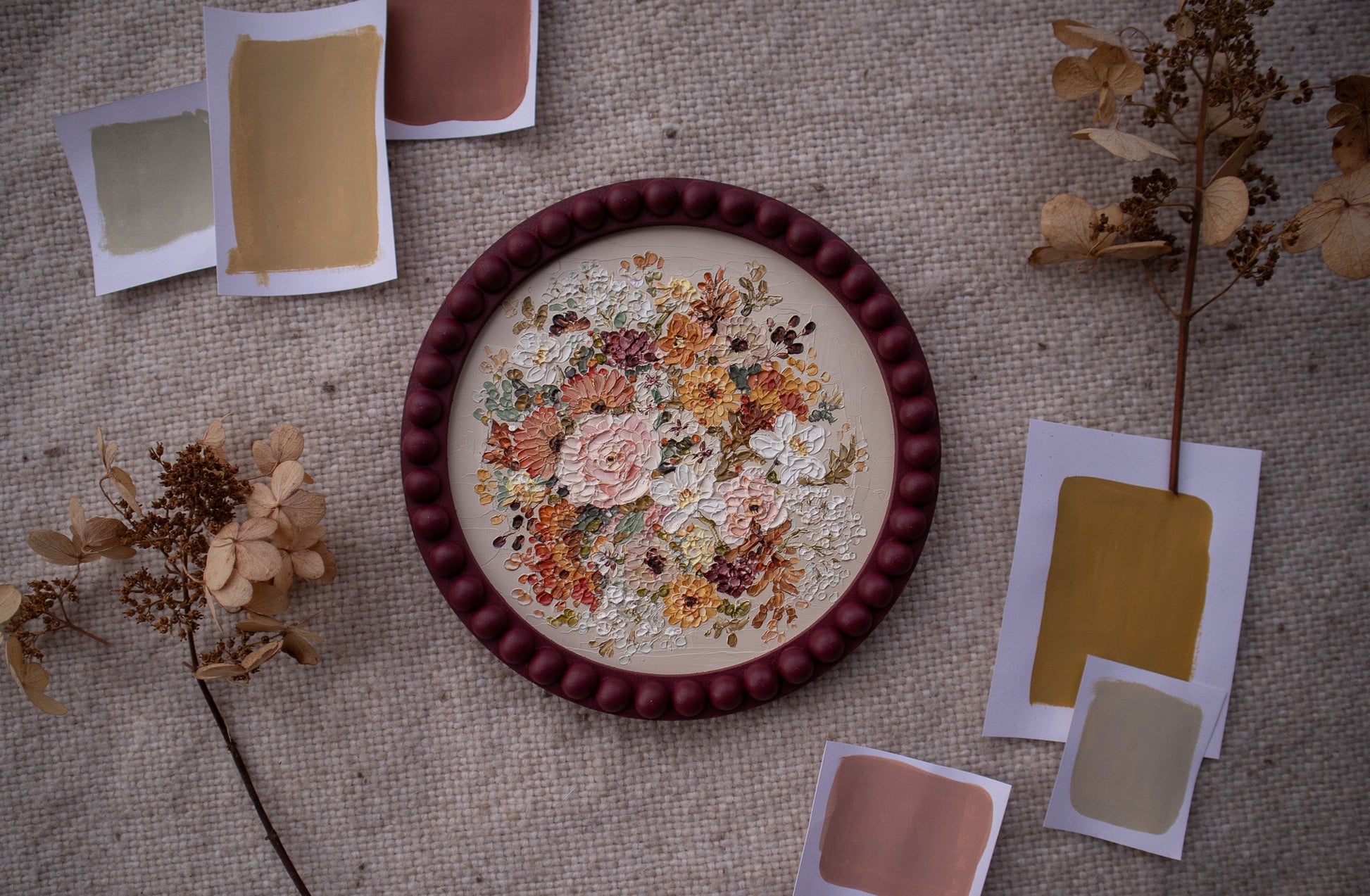 "Autumn III" is a gorgeous original with a neutral background contrasted by a rich, circular bouquet of autumn florals. This piece is inspired by the beauty and elegance of the changing season and showcases all of the vibrant autumn colors we know and cherish.