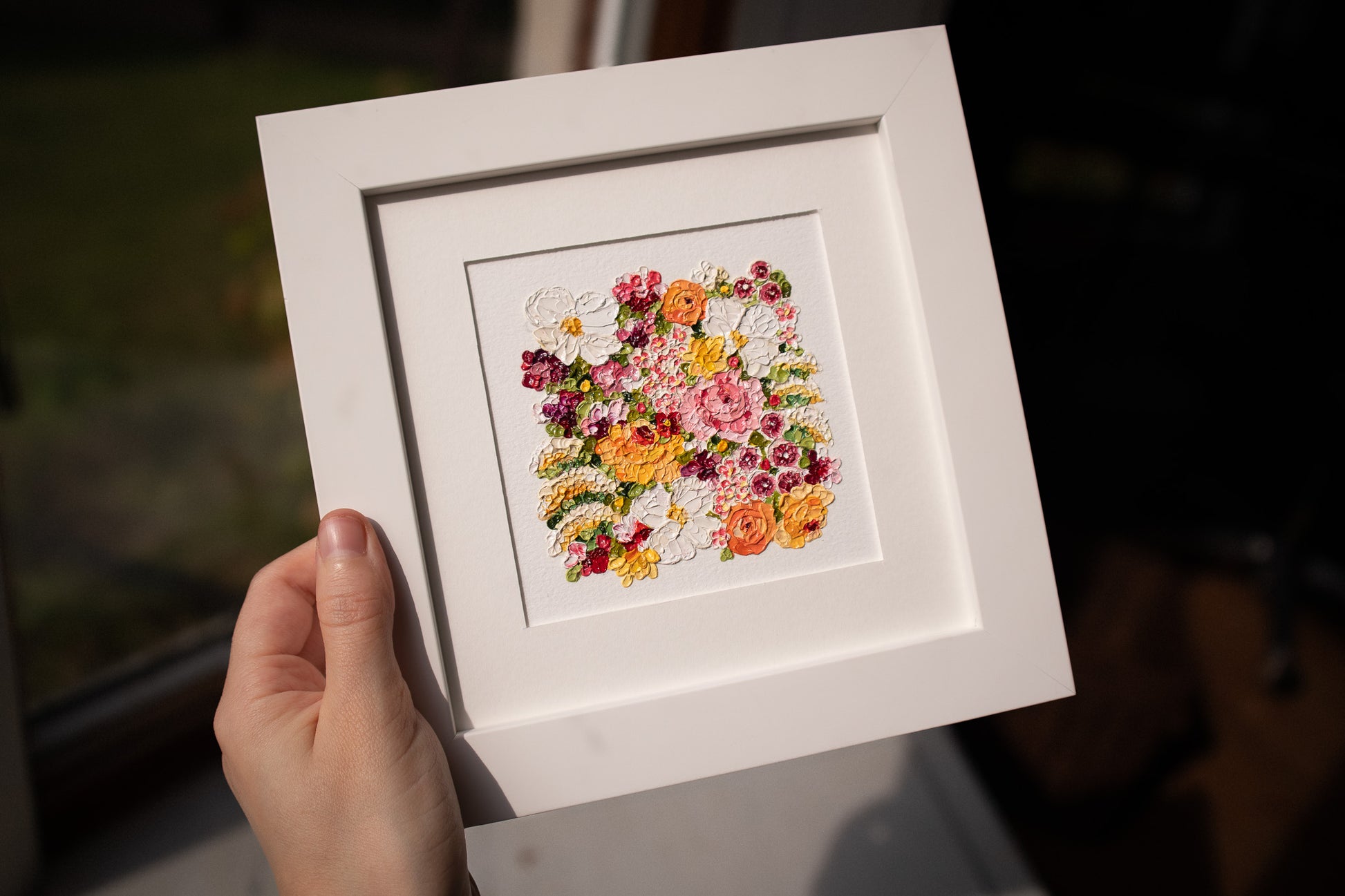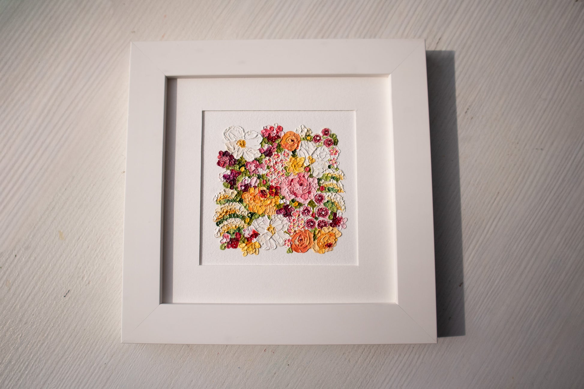 "Abundant" 3.5x3.5" original painting on 5x5" prepared oil paper. Solid wood frame with white veneer, outside dimensions are 7.5x7.5".