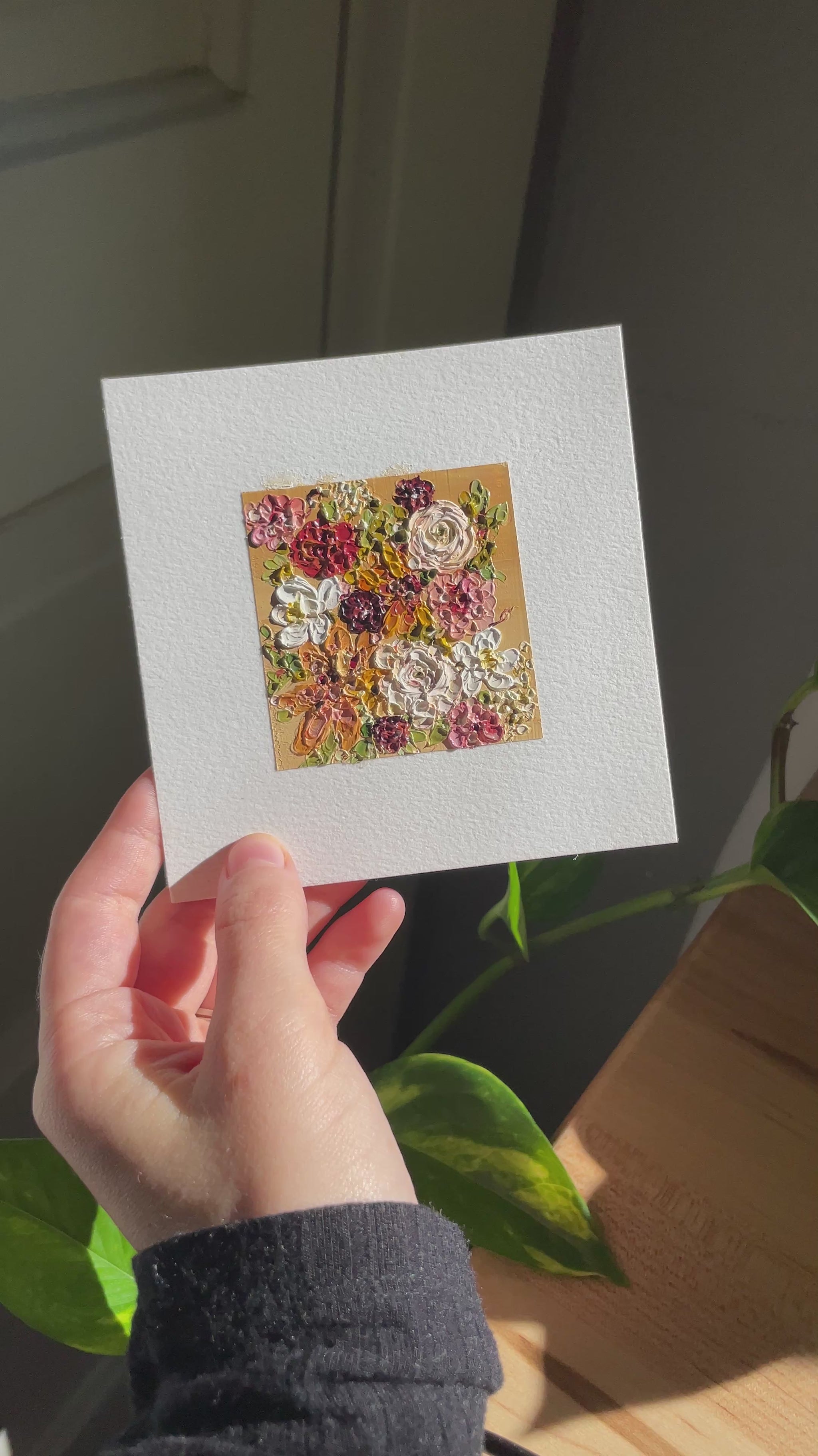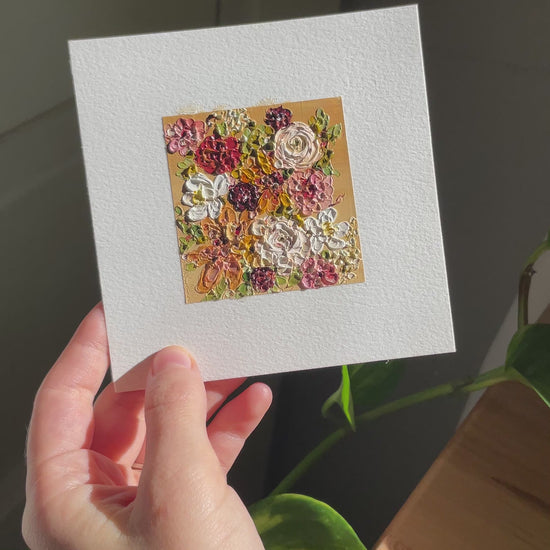 "Golden Autumn" 2.25" x 2.25" Mini Original Oil Painting on 4.25" x 4.25" prepared cotton paper. Minor smudge of paint on paper border, however this does not affect the integrity of the piece and will not be seen after framing. xoxo