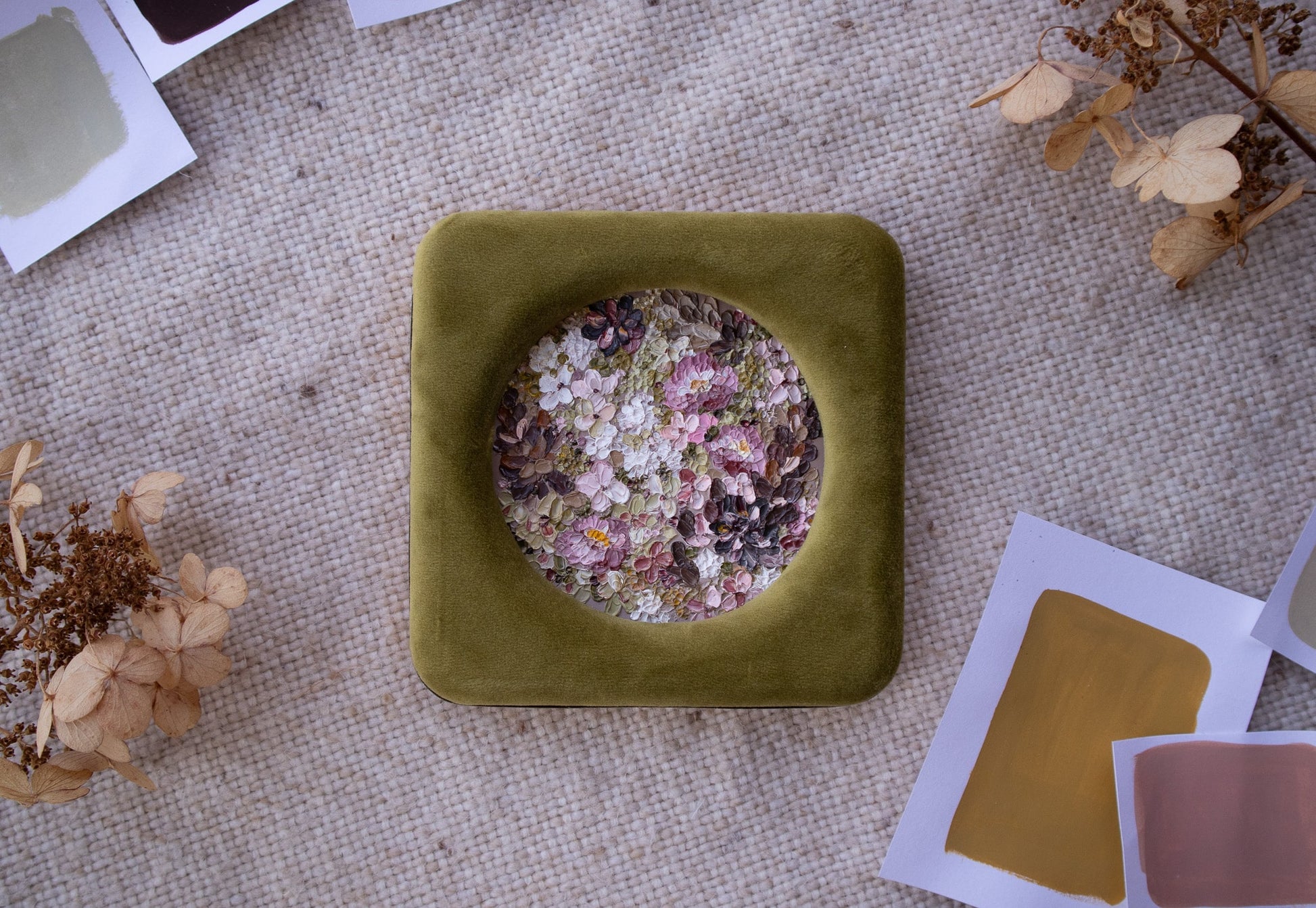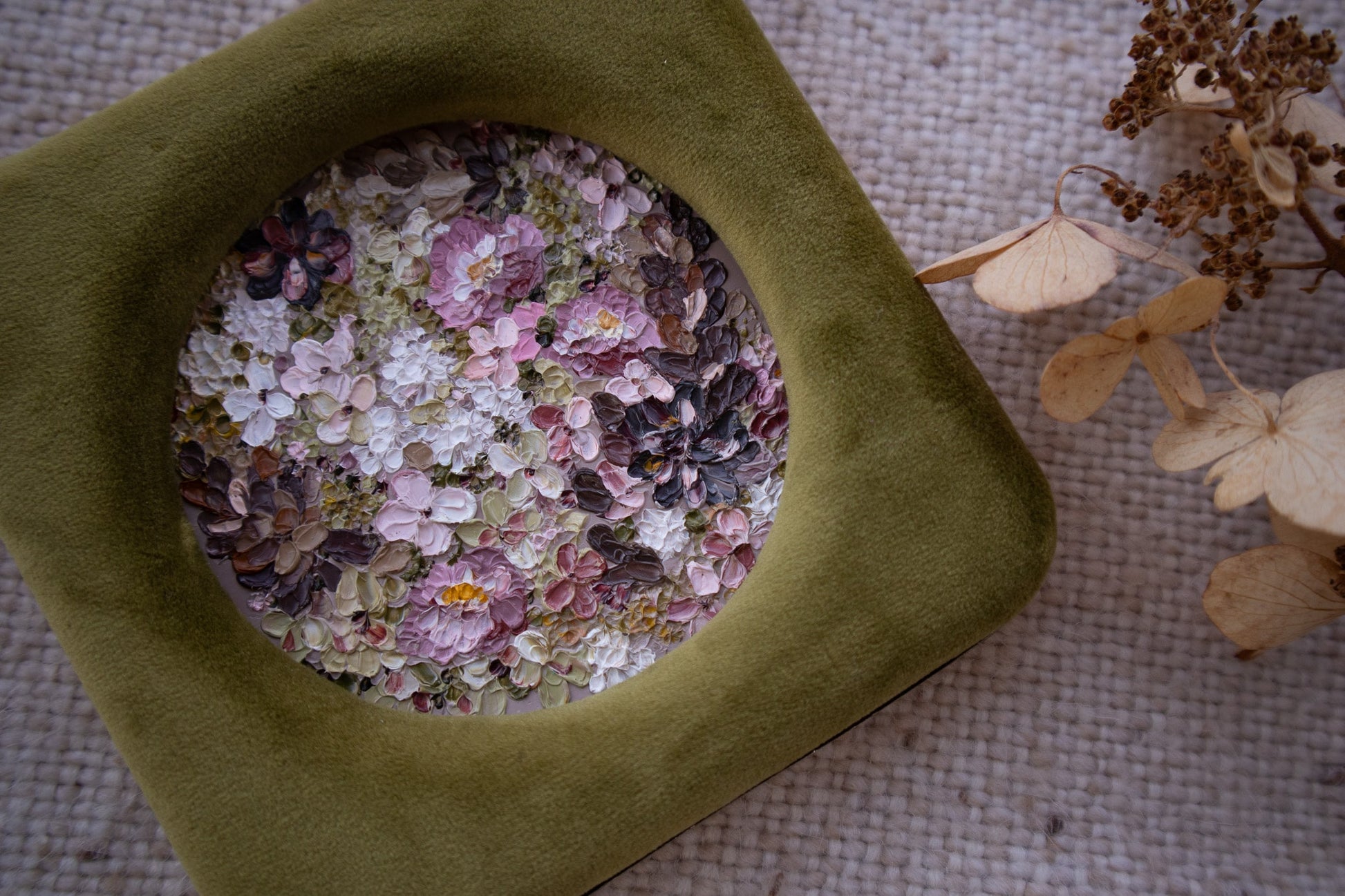 "Mauve + Moss" 4x4" framed original oil painting on prepared cotton paper. Framed in a rich green velvet frame and ready to be displayed as soon as you receive it!